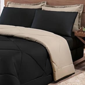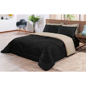 Kit Edredom + Jogo De Lençol Aconchego Look House Dupla Face Solteiro 04 Peças - Preto/ Caqui