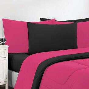 Marca: Enxovais Davy | Estampa: Não se Aplica | Medidas: 01 Edredom Solteiro Dupla Face Liso 1,60m x 2,40m01 Porta Travesseiro 70cm x 50cm01 Lençol de Cima 1,60m x 2,40m 01 Lençol de Baixo para Colchão 0,88m x 1,88m x 0,30m (Elástico em toda a volta)01 Fronha 70cm x 50cm | Número de Peças: 05 Peças | Material: Agodão | Cor Predominante: Pink /Preto | Cama Indicada: Solteiro