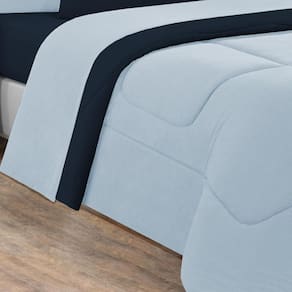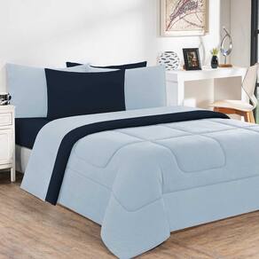 Marca: Enxovais Davy | Estampa: Não se Aplica | Medidas: 01 Edredom King Dupla Face Liso 2,50m x 2,90m02 Porta Travesseiros 70cm x 50cm01 Lençol de Cima 2,50m x 2,90m 01 Lençol Casal de Baixo para colchão 1,93m x 2,03m x 0,30m (Elástico na volta toda)02 Fronhas 70cm x 50cm | Número de Peças: 07 Peças | Material: Agodão | Cor Predominante: Azul Bebê/Azul Marinho | Cama Indicada: King