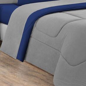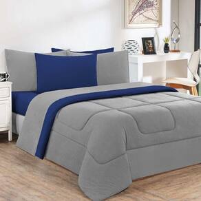 Kit Edredom + Jogo De Lençol Malha 100% Algodão Gran Moratta 7 Peças Queen - Cinza/azul Royal