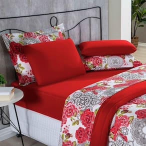 Kit Edredom + Jogo De Lençol Malha 100% Algodão Primavera 4 Peças Solteiro - Floral Vermelho