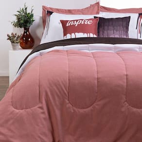 O edredom apresenta um design dupla face: uma face combina linho com tecido Hipercal 400 fios em cores contrastantes, enquanto a outra face é exclusivamente em tecido Hipercal 400 fios. Conta com manta interna presa em toda a lateral para evitar embolamento no dia a dia ou durante a lavagem. A fronha e a capa de almofada estampadas acrescentaram um charme especial, enquanto o porta-travesseiro em linho com debrum harmonizado com o tom marcante do edredom.