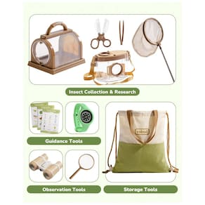 Desperte a Curiosidade! O Kit de Aventura Infantil ROBUD foi projetado para despertar a curiosidade e promover o amor pelo ao ar livre nas crianças. Diversão Educacional. Este conjunto é mais do que um simples brinquedo. O Kit de Acampamento para Crianças oferece valor educativo por meio de brincadeiras divertidas e interativas. À medida que as crianças descobrem coisas novas, desenvolvem habilidades essenciais como resolução de problemas e observação, tudo isso se divertindo muito. Design Infantil. Cada item é feito com materiais duráveis que resistem ao uso ao ar livre. O tamanho e o peso dos equipamentos são perfeitamente adequados para as mãozinhas. Presente Perfeito! Seja para aniversário, feriado ou qualquer ocasião especial, o Kit de Aventura Infantil ROBUD é uma excelente escolha de presente. Ele incentiva as crianças a saírem, explorarem a natureza e cultivarem um espírito de aventura. Kit de Aventura Completo. Este conjunto abrangente inclui uma lupa para relógio bússola, binóculos infantis, recipiente para borboletas, conjunto de cartões guia, gaiola, rede telescópica, braçadeira, pinça, lupa e bolsa portátil. Possui tudo o que as crianças precisam para se envolver em emocionantes aventuras ao ar livre.
