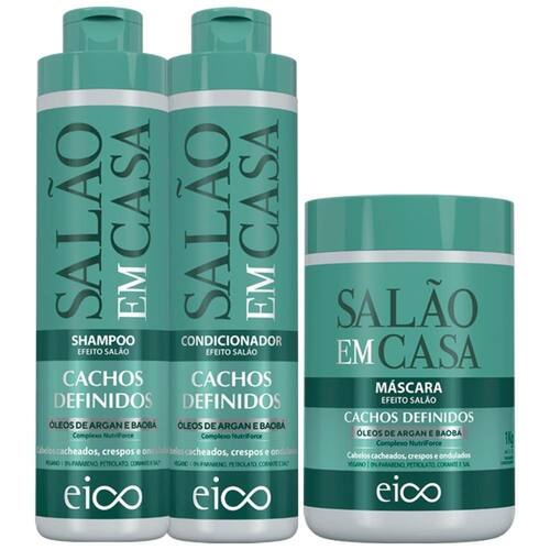 Este kit contém: - 01 Eico Salão em Casa Cachos Shampoo 800ml - 01 Eico Salão em Casa Cachos Condicionador 750ml - 01 Eico Salão em Casa Cachos Máscara 1kg Ean: 7791918673921