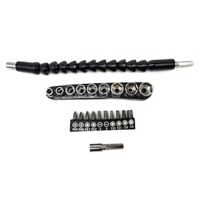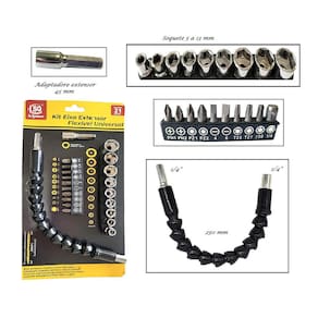Kit eixo extensor flexível chicote universal com soquete bits eixo extensor flexível universal é ideal para ser conectado em parafusadeira e chave catraca manual não inclusos auxiliando a realização de trabalhos em lugares apertados e de difícil alcance, facilidade em apertar ou desapertar parafusos em lugares de difícil acesso e pode ser utilizado em curva, proporcionando excelente custo benefício; é só trocar os bits e usar philips, fenda, allen, torx, soquete. A proteção de saída flexível protege sua mão enquanto o eixo gira. Contém: 1 eixo flexível universal 250mm pontas de 1/4 10 bits de chave: fenda: sl 4, sl5, sl6 phillips: ph1, ph2, pz1, pz2 torx t-10 e t-15 adp 1 adaptador e extensor soquete 45mm 9 soquetes: 5,6,7,8,9,10,11,12 e 13mm composição: metal Marca: Sq-kamach