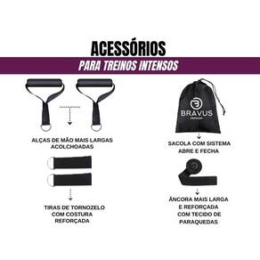 Kit Elástico Extensor Tubing Premium Bravus Sport Kit Tubing Premium 11 peças 68kg de resistência Bravus Sport - Látex 100% Natural Linha Bravus Premium - Superioridade em Todos os Detalhes O Kit Tubing Premium 11 peças Bravus Sport foi feito para os usuários mais exigentes e que buscam um produto de alta resistência para superar todos os limites e levar seu treino para outro nível. O elástico tubing antipressão é feito de material de qualidade premium, 100% látex Natural. Os mosquetões de aço resistente e as tiras firmemente costuradas também evitam o rasgo, mesmo sob a extrema resistência ao estiramento. O Kit Premium Bravus vem com 5 elásticos de borracha em forma de tubo duplamente reforçados, feitos de látex 100% Natural. Cada elástico tem 1,20 m de comprimento com garras em metal de alto calibre e que permitem um treino muito mais potente. É possível realizar os exercícios usando 1 ou até 5 elásticos ao mesmo tempo, criando assim, mais de 50 níveis diferentes de resistência. O Kit Premium Bravus é tão completo que é possível fazer exercícios para trabalhar diversos grupos musculares tanto superiores, como: braços, peitoral e costas, quanto inferiores: glúteos, coxas, pernas e panturrilhas. O kit Inclui: 5 Elásticos Tubing em 100 % látex natural. Gancho em aço inoxidável costurados em tecido resistente e costura reforçada, sendo:1 elástico amarelo de 4.5 kg de resistência1 elástico verde de 9 kg de resistência1 elástico vermelho de 13,6 kg de resistência1 elástico azul de 18.2 kg de resistência1 elástico preto de 22.6 kg de resistência2 alças de mão revestidas de espuma2 tiras para tornozelo1 âncora para colocar na porta1 bolsa em nylon