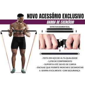 É possível realizar os exercícios usando vários elásticos ao mesmo tempo. O Kit Tubing Premium 68Kg com Barra de exercício é tão completo que é possível fazer exercícios para trabalhar diversos grupos musculares tanto superiores, como: braços, peitoral e costas, quanto inferiores: glúteos, coxas, pernas e panturrilhas.