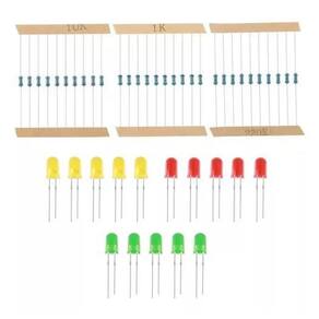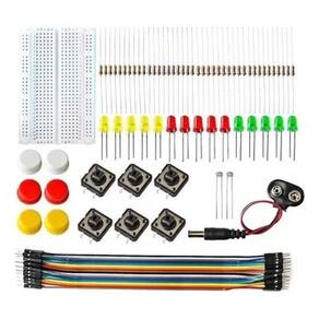 1 uno r3 com microcontrolador atmega328p, ideal para iniciantes em eletrônica e programação. 20 jumpers dupont macho-macho para conexões rápidas e seguras. 1 cabo usb para fácil conexão ao computador. 1 protoboard 400 furos para montagem de circuitos sem solda. 5 led vermelho, 5 led amarelo e 5 led verde para projetos de sinalização. 10 resistores de 220r, 1k, 10k e 100k para controle de corrente. 2 fotoresistor 5516 para detecção de luz. 6 botões grandes com tampas coloridas para interação com o projeto. 1 conector de bateria 9v para alimentação externa. 40 pinos para soldar.