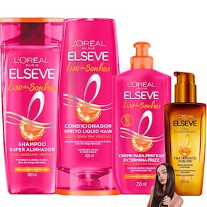 Kit Elseve Óleo Extraordinário Liso dos Sonhos AHA Queratina Bem vindo a a loja Flocus. É um prazer tê-lo a como nosso a cliente CONTEÚDO DO KIT: 1 Elseve Shampoo Super Alinhador Liso dos Sonhos Loreal Paris - 400ml 1 Elseve Condicionador Efeito Liquid Hair Liso dos Sonhos Loreal Paris - 400ml 1 Elseve Creme para Pentear Extermina Frizz Liso dos Sonhos Loreal Paris - 250ml 1 Óleo Extraordinário L'Oréal Paris Elseve - 100ml Chegooou A nova linha Elseve Liso dos Sonhos proporciona cabelos lisos, alinhados e sem frizz por 1 semana O Shampoo Super Alinhador limpa e fortalece a fibra preparando os fios para um liso de longa duração e com frizz controlado. O Condicionador Efeito Liquid Hair sela e restaura a superfície da fibra para um liso com efeito liquid hair: desmaiado, com movimento superfluido e brilho intenso. O Creme para pentear Extermina Frizz desembaraça e combate a umidade para um liso com frizz controlado por até 72h, desde a primeira aplicação. Com filtro UV e proteção térmica, o Creme para Pentear Extermina Frizz é a solução para um cabelo alinhado e livre de frizz. Resultados que resistem até 5 lavagens Para turbinar seu tratamento capilar, o kit contém o famoso e um dos mais vendidos Óleo de Tratamento Elseve Óleo Extraordinário Nutrição, pois ele tem a combinação perfeita de micro-óleos de flores preciosas, garantindo maciez e brilho aos cabelos. O segredo dos óleos de flores preciosas promovem uma nutrição perfeita e uma leveza infinita. Camomila Linhaça Girassol Gardênia Lótus Rosa Canina INDICAÇÃO: Cabelos naturalmente lisos, alisados e com frizz. MODO DE USO: Shampoo: Aplique em todo o comprimento, até as pontas. Deixe o produto agir e enxágue abundantemente. Condicionador: Aplique nos cabelos molhados Massageie suavemente e enxágue. Repita a aplicação se necessário. Creme para Pentear: Aplique no cabelo úmido ou seco Não enxágue. Penteie como de costume. Óleo Extraordinário: O Óleo Extraordinário de tratamento é leve e multiuso, pode ser tanto em cabelos molhados quanto secos Pode ser antes da escova para nutrir os fios; como finalizador para malear a fibra; em qualquer momento para disciplinar o frizz e ressaltar a luz dos cabelos. Agradecemos por escolher a Loja Flocus e por confiar em nós para cuidar da beleza dos seus cabelos. Em caso de dúvidas, favor enviar sua pergunta Flocus Marca: Não Informado Ean: 7735118889041