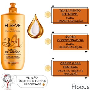 Kit Elseve Óleo Extraordinário Tratamento NutritivoMilagroso Bem vindo a a loja Flocus. É um prazer tê-lo a como nosso a cliente CONTEÚDO DO KIT: 1 Shampoo Elseve Óleo Extraordinário Nutrição Argan e Marula 200ml 1 Condicionador Elseve Óleo Extraordinário Nutrição Argan e Marula 200ml 1 Creme de tratamento Elseve Óleo Extraordinário Nutrição Óleos de Argan e Marula 300G 1 Creme Milagroso 3 em 1 L'Oréal Paris Elseve Óleo Extraordinário 6 Óleos de Flores Preciosas - 500ml 1 Óleo Extraordinário L'Oréal Paris Elseve - 100ml Um cabelo seco parece estar sem vida, pois ele está opaco, sem brilho e tem um toque áspero. O kit Elseve Óleo Extraordinário Nutrição é perfeito para esse tipo de problema. A linha Elseve Óleo Extraordinário foi desenvolvida para nutrir cabelos secos, promovendo suavidade infinita, brilho excepcional e vitalidade deslumbrante. Com a tecnologia de micro óleos de argan e marula nutre os fios, sem pesar. O segredo dos óleos de argan e marula promovem uma nutrição perfeita e uma leveza infinita. Resultado: O cabelo fica cheio de vida, com toque sedoso e brilho deslumbrante. INDICAÇÃO: Cabelos secos Cabelos muito secos BENEFÍCIOS: Limpa, dá brilho e nutre; Fios Leves e com vitalidade; Cabelos hidratados e com textura leve; Promove Inovação; Possui micro óleos essenciais; Brilho excepcional; Vitalidade deslumbrante. MODO DE USAR: . Shampoo: Aplique nos cabelos molhados e massageie suavemente; Enxágue. Repita a operação se necessário. . Tratamento Nutritivo: Após o uso do Shampoo, aplique sobre os cabelos lavados e úmidos Deixe agir por 5 minutos Enxague bem. . Condicionador: Aplique o Condicionador em todo o comprimento até as pontas. Deixe o produto agir. Enxague abundantemente. . Creme 3 em 1: Pode ser como: Super Condicionador para Desembaraçar: aplique em todo comprimento até as pontas. Deixe agir por 3 minutos e enxágue. Tratamento Intensivo para Transformar: aplique em todo comprimento até as pontas. Deixe agir por 5 minutos ou mais e enxágue. Creme para Pentear para Hidratar e/ou Finalizar: aplique no cabelo úmido ou seco, não enxágue e penteie como de costume. . Óleo Extraordinário: O Óleo Extraordinário de tratamento é leve e multiuso, pode ser tanto em cabelos molhados quanto secos Pode ser antes da escova para nutrir os fios; como finalizador para malear a fibra; em qualquer momento para disciplinar o frizz e ressaltar a luz dos cabelos. Não perca a oportunidade de experimentar a magia dos cabelos extraordinários Agradecemos por escolher a Loja Flocus e por confiar em nós para cuidar da beleza dos seus cabelos. Em caso de dúvidas, favor enviar sua pergunta Flocus