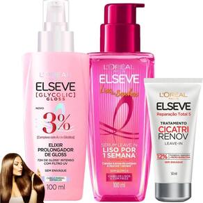 Kit Elseve Sérum Leave In Cicatri Renov Elixir Glycolic Bem vindo a a loja Flocus. É um prazer tê-lo a como nosso a cliente CONTEÚDO DO KIT: 1 Elseve Sérum Leave-in Liso Por 1 Semana Liso dos Sonhos L'oreal Paris - 100ml 1 Sérum Elixir Prolongador de Gloss L'Oréal Paris Elseve Glycolic Gloss - 100ml 1 leave-in Cicatri Renov Elseve Reparação Total 5 - 50ml Chegooou A nova linha Elseve Liso dos Sonhos proporciona cabelos lisos, alinhados e sem frizz por 1 semana O Sérum Leave-in LOréal Paris Elseve Liso dos Sonhos é um finalizador capilar desenvolvido para quem deseja um cabelo mais liso, alinhado e protegido contra a umidade. Sua tecnologia ativada por calor cria uma barreira invisível na fibra capilar, proporcionando um efeito de cabelos lisos por até 1 semana. Resultados que resistem até 5 lavagens Cabelo poroso e sem brilho A linha Elseve Glycolic Gloss de LOréal Paris garante 3X mais gloss que resiste a 6 lavagens. Sua fórmula com pH Ácido rica em Ácido Glicólico, combate a porosidade e sela as cutículas para um cabelo visivelmente saudável e alinhado para um brilho gloss. O sérum Prolongador de Gloss Elixir, com uma inovadora fórmula com pH ácido e enriquecida com 3% Complexo com Ácido Glicólico, filtro UV e proteção térmica, possui tripla ação: 1. Sela intensamente os fios, preenchendo as falhas da fibra capilar. 2. Na superficie, lamina a cutícula, alinhando-a para refletir a luz. 3. Protege os fios contra futuras agressões externas. Cabelo visivelmente saudável e alinhado para um brilho gloss que dura até 72h. O Leave-In Cicatri Renov Elseve Reparação Total 5 identifica e repara os danos fio a fio do cabelo sem pesar. Possui 10 benefícios para uma plástica capilar: Reparação instantânea; Selagem das pontas; 100% mais brilho; Maciez profunda; Toque deslizante; Desembaraço imediato; 10x menos quebra; Anti-frizz; Anti-umidade; Proteção térmica. Para todos os tipos de cabelo, renova e protege a qualquer hora e em qualquer lugar. Pode ser com o cabelo seco ou molhado, antes ou depois do secador. MODO DE USO: Sérum: aplique somente nos cabelos úmidos, do comprimento as pontas cobrindo todos os fios. na 1 aplicação da semana, ative a fórmula com a chapinha após a secagem. ao longo da semana, após cada lavagem reaplique e ative somente com o secador. esqueça a chapinha por 1 semana. agite antes de usar. Elixir: Aplicar nos cabelos molhados ou secos Pode usar antes da escova ou como finalizador para malear a fibra Sem enxágue. Leave-in: Distribua uma pequena quantidade nos fios secos ou úmidos, do comprimento às pontas. Não enxague OBS: Com proteção térmica, pode ser antes ou depois de escova ou chapinha. Agradecemos por escolher a Loja Flocus e por confiar em nós para cuidar da beleza dos seus cabelos. Em caso de dúvidas, favor enviar sua pergunta Flocus Marca: Não Informado Ean: 7735118889249