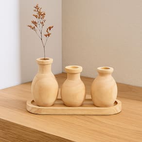 Este conjunto traz um charme natural e atemporal para a decoração. Composto por três mini vasos esculpidos em madeira e uma bandeja retangular no mesmo acabamento, o kit é perfeito para composições delicadas em prateleiras, aparadores ou mesinhas.