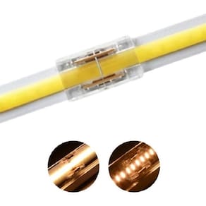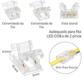 Especificações Técnicas Compatível com fita LED COB de 2 pinos (largura 8mm) Instalação sem solda (encaixe por pressão) Material: Plástico transparente resistente Tensão: 12V ou 24V (conforme a fita LED utilizada) Corrente máxima: 5A