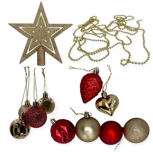 Conteúdo do Kit: - 01 Cordão de Pérolas Dourado - 01 Estrela Dourada - 05 Bolas de 6cm com Glitter - 05 Bolas de 6cm Globo Cristalizado - 05 Bolas de 6cm Fosca Vermelha - 05 Bolas de 6cm Fosca Dourada - 03 Bolas de 4cm com Glitter Vermelha - 03 Bolas de 4cm com Glitter Dourada - 03 Bolas de 4cm Metalizada - 03 Bolas de 4cm Espiral - 02 Corações Dourados - 02 Pinhas Vermelhas