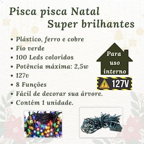 - quantidade de enfeites: 21 - tipo de iluminação: led colorido - 100 leds - 8m - fio verde - 8 funções - voltagem: 110-127v padrão brasileiro - potência: 2,5w - material: plástico de alta qualidade - cor: as cores dos enfeites são enviadas aleatóriamente Marca: Zein Natal