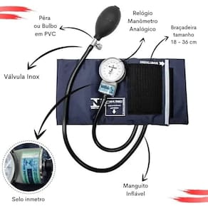APARELHO DE PRESSÃO OU PA MED + BOLSA DE PROTEÇÃO• Verificado e aprovado pelo INMETRO;• Manguito e pêra em PVC;• Braçadeira em nylon, com fecho de contato.- Garantia da PA MED: 2 anos. ESTETOSCÓPIO RAPPAPORT DUPLO PA MED (ADULTO E PEDIÁTRICO)• Inclui olivas e diafragmas para conversão em diferentes formas de uso;• Tubo duplo para ausculta mais precisa;• Diafragma de alta sensibilidade;• Acompanha kit de acessórios contendo: 2 pares de oliva, 2 membranas e 3 diafragmas;• Registro Ministério da Saúde / ANVISA.- Garantia da PA MED: 2 anos. OXIMETRO DE DEDO• Monitorização da porcentagem de saturação de oxigênio no sangue (spo2) e dos batimentos cardíacos por minuto;• Alta precisão;• Fácil de usar;• Desligamento automático.