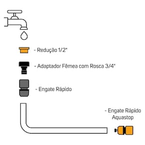 O kit é composto pelo Adaptador Fêmea WAP e o Engate Rápido Aquastop WAP. Dessa forma, o adaptador é utilizado como um facilitador para o sistema de irrigação, com rosca externa 3/4 e componente extra de redução 1/2, enquanto o engate rápido Aquastop possui conexão tipo click aos acessórios de irrigação, através de 3 garras.