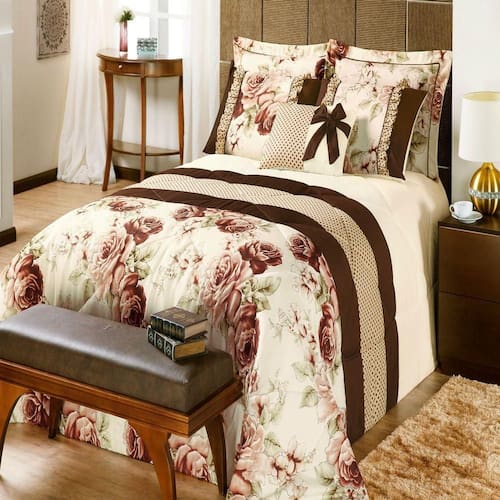 Kit Enxoval Queen Vitória Palha E Tabaco Enxovais Aquarela 7 Peças A Linha Vitória é um charme com misturas de estampas florais e detalhes em poá. O edredom possui estampas florais e detalhes em poá, possui dois porta travesseiros estampados com abas e dois porta travesseiros estampados com babados e uma almofada com detalhes em poá e laço em fita. Confeccionado em Tecido Superior em 60% Algodão e 40% Poliéster, Tecido Inferior em 100% Poliéster e Enchimento em 100% Poliéster.Composição:01 Edredom 2,60m x 2,40m02 Porta Travesseiros 70cm x 50cm02 Porta Travesseiros c/ Babados 65cm x 45cm01 Capa de Almofada 45cm x 35cm01 Refil Almofada 45cm x 35cmTamanho - Queen