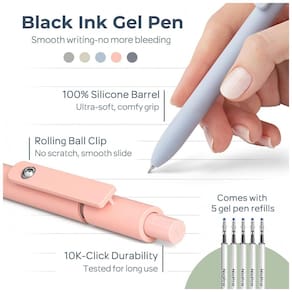 O conjunto inclui 5 canetas em gel de secagem rápida com tinta preta, corpo em ABS e ponta fina, projetadas para escrita suave e contínua, com recarga por 5 refis de tinta. Traz ainda 12 marcadores pastel com corpo achatado e ponta chanfrada para traços finos ou marcações largas, com tinta à base de água de secagem rápida.