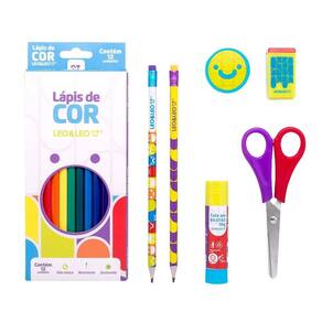 O Kit Escolar Leo&Leo é completo, perfeito para atividades extras ou escolares. Ele possui 6 componentes: caixa de lápis 12 cores, 2 lápis grafite hb, 1 apontador com depósito para resíduos, 1 tesoura 13cm, 1 borracha com formato e 1 cola bastão de 10g.