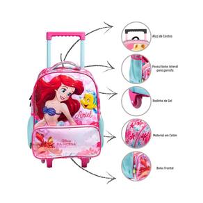 Design exclusivo da pequena sereia: com a ariel em destaque, esse kit vai encantar as pequenas fãs. Mochila de rodinha: facilita o transporte dos materiais escolares e proporciona mais conforto para a criança. Ajuste de altura da alça para facilitar o transporte. Lancheira: com forro térmico é ideal para guardar lanches e bebidas conservando a temperatura, com alça regulável para maior conforto. Zíper resistente: garante maior durabilidade e segurança em todos os itens. Bolsos laterais: ideais para guardar garrafinhas ou outros objetos pequenos. Alça de mão e de costas: versatilidade para carregar a lancheira da forma mais confortável. Detalhes personalizados: tornam o kit ainda mais especial e único.