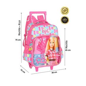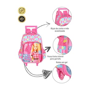 Kit barbie mochila de rodinhas 2em1 costas e rodas+lancheira térmica mochila com rodas: Possui rodas e alça de costas ambas acolchoadas Confeccionada em poliéster Fechamento em zíper Puxadores personalizados 2 compartimentos espaçosos 2 bolsos laterais para garrafa Design exclusivo Etiqueta de identificação na parte traseira Medidas aproximadas: Altura: 45 cm Largura: 15 cm Comprimento: 30 cm
