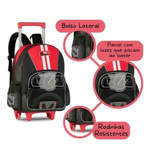 O Kit Fast Machine une design moderno, praticidade e muita diversão A Mochila de Carrinho FM25030 é confeccionada em poliéster resistente, possui puxadores de metal personalizados e etiquetas emborrachadas que deixam o visual ainda mais moderno. Seu compartimento principal é amplo e ideal para guardar todo o material escolar, com fechamento por zíper e bolso frontal que ajuda a manter tudo bem organizado. Nas laterais, os bolsos telados permitem carregar garrafinhas com facilidade. O destaque fica por conta do painel frontal com luzes que piscam ao bater, tornando a mochila divertida e interativa Conta ainda com rodinhas resistentes, puxador em alumínio com duas alturas, base de apoio e alças de costas acolchoadas, permitindo o uso como mochila ou no modo carrinho. Possui também alça de mão superior. Dimensões aproximadas: 40x30x13cm. Acompanha Lancheira térmica FM25032, espaçosa e com revestimento interno que mantém a temperatura dos alimentos, com alça de costas, alça carona e alça de mão. 23x23x11cm E para completar, o Estojo FM25033, com estampa combinando, zíper personalizado e excelente espaço interno para guardar lápis e canetas. 21x9x6cm Marca: Não Informado Ean: 7795028709419