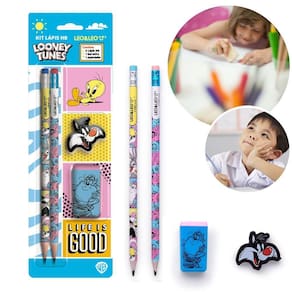 - O kit inclui 2 lápis HB, um apontador e uma borracha, tudo embalado em um prático blister.
