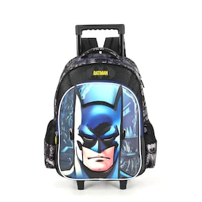 1. Mochila de Rodinhas G Luxcel Batman Destaque: Estampa frontal poderosa do rosto do Batman (Efeito 3D/Relevo). Funcionalidade: Carrinho embutido, haste retrátil e rodinhas resistentes para fácil locomoção. Versatilidade: Possui alças de costas e alça de mão. Organização: Amplo espaço (Tamanho G), bolso frontal e bolsos laterais em mesh para garrafa.