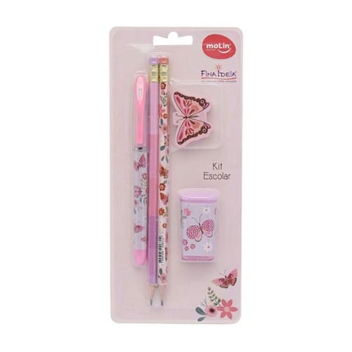 Contém: 1 caneta esferográfica, 2 lápis pretos HB, 1 borracha e 1 apontador com depósito.