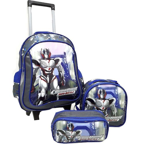 Kit Escolar Infantil Robot KT6317 Mochila De Roda - Compartimento principal com ziper duplo - Bolsos laterais em tela e elastico - Frente Personagem - 2 rodas de silicone super deslizantes - Pés de apoio e descanso - Puxador em aluminio leve e regulavel na altura da criança - Alças acolchoadas, reforçadas e ajustaveis - Tamanho em cm AxLxP 41x31x21