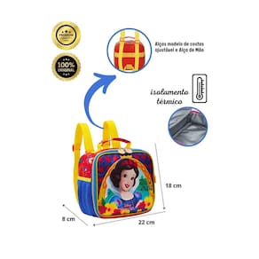Design da branca de neve: todos os itens possuem um design exclusivo com a personagem favorita das crianças. Lancheira: ideal para guardar lanches e bebidas. Estojo duplo: espaço suficiente para organizar lápis, canetas e outros materiais. Zíper resistente: garante maior durabilidade e segurança em todos os itens. Alça de mão e de costas na lancheira: versatilidade para carregar a lancheira da forma mais confortável. Detalhes personalizados: tornam o kit ainda mais especial e único.