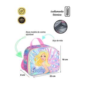 Kit Escolar Lancheira Térmica+Estojo Triplo Barbie Holográfica: Lancheira térmica Barbie Holográfica: Confeccionada em Poliéster Forro térmico Possui alça de ombro e de mão dupla Etiqueta de identificação na parte traseira