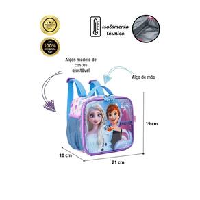 Design exclusivo Frozen com detalhes holográficos: Um show de brilho e magia para as pequenas fãs. Lancheira: Com forro térmico é ideal para guardar lanches e bebidas mantendo a temperatura, com alça regulável. Estojo duplo: Espaço suficiente para organizar lápis, canetas e outros materiais. Zíper resistente: Garante maior durabilidade e segurança em todos os itens. Bolsos laterais: Ideais para guardar garrafinhas ou outros objetos pequenos. Alça de mão: Facilita o transporte da lancheira.