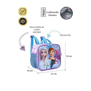 Design exclusivo Frozen com detalhes holográficos: Um show de brilho e magia para as pequenas fãs. Lancheira: Com forro térmico é ideal para guardar lanches e bebidas mantendo a temperatura, com alça regulável. Estojo duplo: Espaço suficiente para organizar lápis, canetas e outros materiais. Zíper resistente: Garante maior durabilidade e segurança em todos os itens. Bolsos laterais: Ideais para guardar garrafinhas ou outros objetos pequenos. Alça de mão: Facilita o transporte da lancheira.