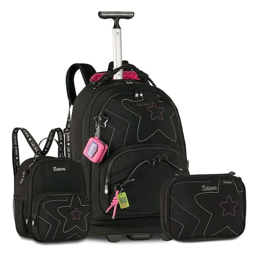 O kit Luluca foi pensado para deixar a volta às aulas cheia de estilo e praticidade. A mochila de carrinho LU27029 é funcional e cheia de personalidade, com matelassê de estrelas coloridas, chaveiros exclusivos e acabamento premium. Além do espaço generoso no compartimento principal, conta com divisórias acolchoadas para notebook e tablet, bolsos frontais para organização e laterais para garrafinhas. Pode ser Utilizado como mochila de carrinho, com rodinhas resistentes e puxador de metal regulável, ou como mochila de costas, com alças acolchoadas escondidas em compartimento traseiro e protetor de rodinhas para não sujar a roupa. A lancheira térmica LU27034 é superversátil, pois pode ser Utilizado de três jeitos: pela alça de mão, de forma transversal ou até mesmo nas costas, como uma mochilinha. Com bolso frontal de fácil acesso, laterais teladas e revestimento interno térmico, mantém os alimentos sempre bem conservados. O kit fica ainda mais completo com o estojo box LU27032, moderno e espaçoso, com capacidade para até 100 lápis ou canetas. Possui 36 elásticos para fixar o material, além de um estojo interno separado com fechamento em zíper, tudo confeccionado em poliéster com matelassê de estrelas. Dimensões aproximadas: Mochila: 48x35x19cm Lancheira: 27x20x12cm Estojo: 22x16x6cm Marca: Não Informado Ean: 7795028529291