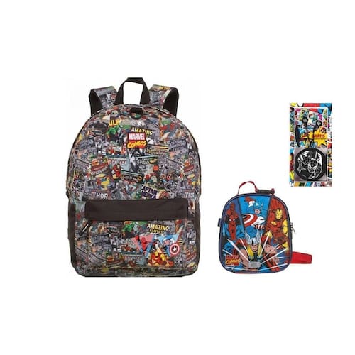Mochila de costas marvel comics heroes possui um amplo espaço, com estampa as hqs mais famosas do mundo possui dois bolsos, um principal amplo, e um pequeno frontal perfeito para organizar pequenos objetos puxador personalizado logo emborrachado em alto relevo frontal ''marvel comics'' alças reguláveis e estampadas material poliéster medidas: 41 cm x 31 cm x 15 cm
