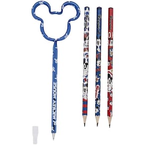 Kit Escolar Mickey 3 Lápis + 1 Caneta O Kit Escolar contém produtos 100% personalizados com imagens do personagem. Contém: - 01 caneta esferográfica com tinta na cor azul e com o topo personalizado no formato da cabeça do Mickey; - 03 lápis pretos; Ean: 7899588004196