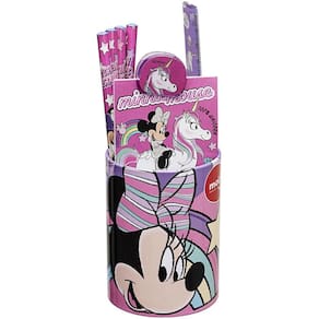 Kit Escolar Minnie Desk Set Com 10 Itens O Kit Desk Set da Minnie é 100% personalizado com imagens da personagem. Contém 10 itens: - 01 Desk; - 01 Régua de 18cm; - 01 Mini prancheta; - 01 Apontador; - 01 Clip; - 01 Borracha; - 04 lápis. Ean: 7899588003601