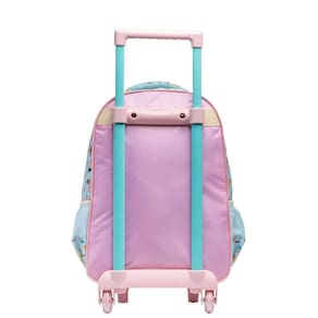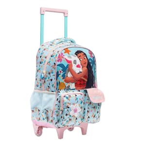 1. Mochila com Rodinhas Moana Disney 16 – Aventura, Estilo e Praticidade para Pequenas Exploradoras! -Frente em PVC vincado com glitter; -Dois bolsinhos frontais com tampa; -Bolsos laterais em mesh; -Patch emborrachado; -Detalhe em PVC com glitter; -Zíper tratorado; -Puxadores emborrachados personalizados; -Alça de mão acolchoada; -Carrinho com hastes achatadas e rodinhas em gel; -Material: Poliéster.