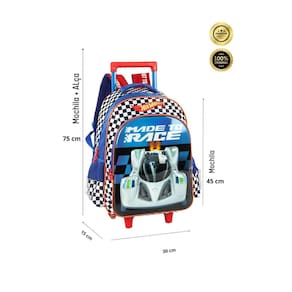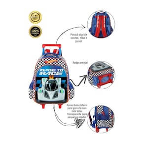 Mochila com Rodas: Confeccionada em Poliéster Fechamento em zíper Puxadores personalizados 2 OU 3 Compartimentos espaçosos 2 bolsos laterais para garrafa Possui RODAS e ALÇA DE COSTAS Design exclusivo luxo Frente 3D Etiqueta de identificação na parte traseira Medidas aproximadas: Altura: 45 cm Largura: 15 cm Comprimento: 30 cm