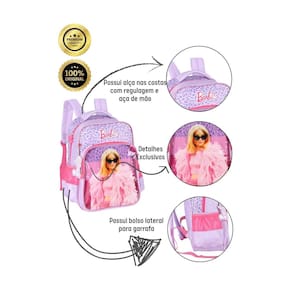 Kit escolar mochila de costas+estojo triplo barbie mochila de costas: Possui alça de costas e mão ambas acolchoadas Confeccionada em poliéster Fechamento em zíper Puxadores personalizados 2 compartimentos espaçosos 2 bolsos laterais para garrafa Design exclusivo Etiqueta de identificação na parte traseira Medidas aproximadas: Altura: 45 cm Largura: 15 cm Comprimento: 30 cm Estojo: Produzido em poliéster Triplo compartimento Cursores personalizados Material altamente resistente Fechamento por zíper de otima qualidade Design personalizado e exclusivo Medida: Altura: 10 cm Profundidade: 09 cm Largura: 22 cm Cuidados: -guarde em um local seco e arejado evitando locais úmidos. - evite colocar excesso de peso no produto para não forçar os zíperes e costuras. - proteja os objetos cortantes e/ou pontiagudos evitando o contato direto com o produto. - evitar altas temperaturas. - cores claras poderão manchar quando em contato com outros objetos ou roupas de cores pigmentadas. Dicas de limpeza: - para a limpeza utilize apenas pano úmido com sabão neutro. - não deixar de molho e secar a sombra.
