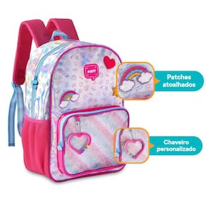 Lancheira Térmica HL24568: Essa lancheira conta com um compartimento único espaçoso, com revestimento térmico que mantém os alimentos frescos por mais tempo. É fechada por zíper com puxadores personalizados e possui duas opções de transporte: alça de ombro ajustável para maior praticidade e alça carona que pode ser acoplada à mochila ou outra bagagem. Seu design holográfico, combinado com os detalhes em glitter e patches atoalhados, faz dela o complemento perfeito para a mochila. Dimensões aproximadas: 18x23x10 cm.