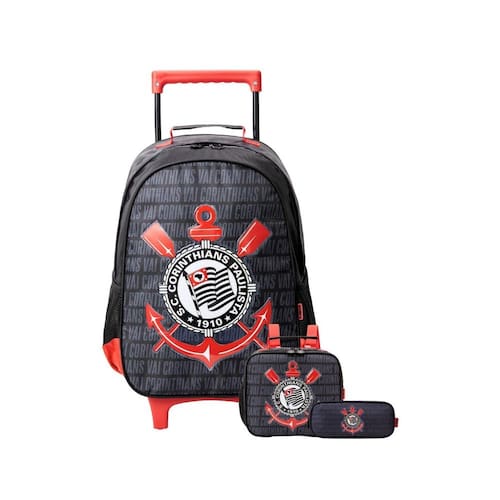 Mochila Rodinha G Escolar Corinthians: Possui RODAS RESISTENTES Confeccionada em Poliéster e PVC Possui 1 compartimentos espaçosos Fechamento em zíper REFORÇADO Dois bolsos laterais telados pra garrafa Regulador de tamanho da alça na parte traseira Puxadores personalizados Medidas: Altura: 40 cm Largura: 30 cm Profundidade: 15 cm