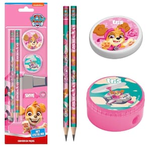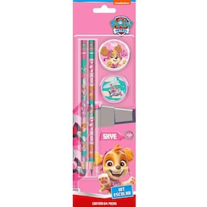O kit escolar patrulha canina possui 2 lápis hb com corpo arredondado + 1 borracha de textura macia e livre de pvc + 1 apontador com lâmina antiferrugem e com depósito que evita sujeiras.
