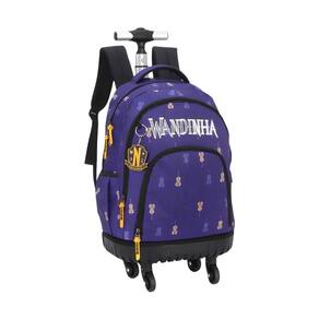 Mochila Com 04 Rodas 360 Wandinha Roxa Luxcel MC47268 Confeccionada em poliéster Acabamento impecável e bem costurado. Possui fecho a zíper Puxadores customizados. Conta com alças acolchoadas e ajustáveis Na parte frontal da mochila possui um compartimento com fechamento em zíper e um chaveiro. possui também puxadores de metal Bolsos laterais telados. Dimensões aproximadas cm : 56 x 31 x 15 cm