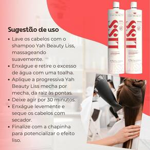 Sugestão de uso: - shampoo: aplique nos cabelos molhados, massageando suavemente o couro cabeludo. Enxágue abundantemente. - progressiva: após lavar os cabelos com o shampoo, aplique a progressiva mecha a mecha, respeitando o tempo de pausa indicado no produto. Enxágue e finalize como desejar.
