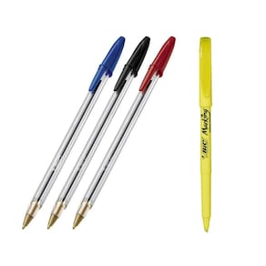 Kit BIC contendo 3 canetas esferográficas BIC Cristal Dura+ escrita média e um marcador de texto Fluorescente amarelo BIC Marking ponta chanfrada. Ideal para ter no seu estojo para levar na escola/faculdade, no seu porta lápis do seu escritório e aonde mais você preferir, porque são itens indispensáveis no seu dia a dia, e com a qualidade BIC que você já conhece!