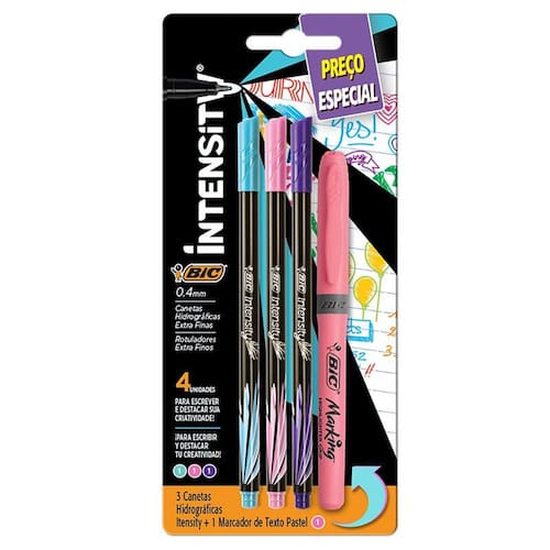Corpo arredondado, tinta a base de agua que não borra e escrita macia.