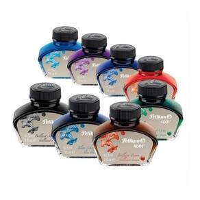 -8 Frascos de tinta Pelikan 4001 62,5ml nas cores: 1 Preto, 1 Azul black, 1 Marrom, 1 Vermelho, 1 Verde, 1 Rosa, 1 Violeta e 1 Azul turquesa.